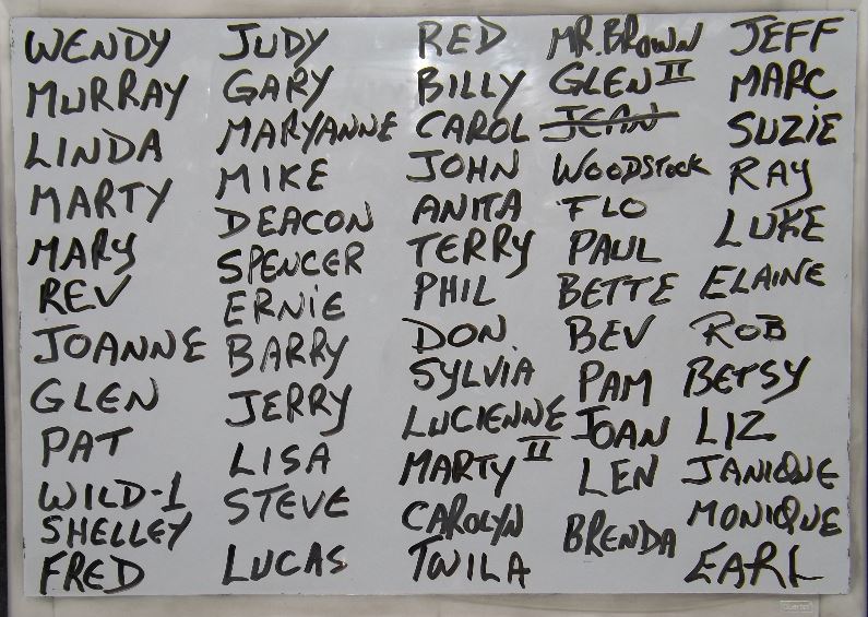 Sixty-One singers at our regular Saturday Night Moose Lodge show. And probably another 30 or so non-singers. I write the names on the white board as soon as I see them come in the door. This is why I no longer use any kind of video scroll to announce names... Can you imagine waiting to scroll through 61 names?? Our singers can often be found checking the board to find out whether they have time for a smoke, or get a drink, or simply to calculate how long before they're called upon to sing.