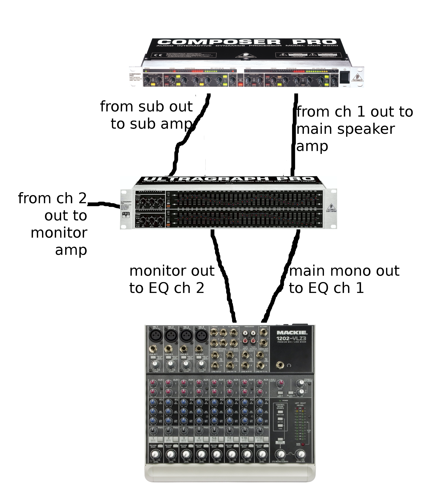 your monitor send goes to the EQ ch 2 in and the ch 2 out goes to your monitor amp.