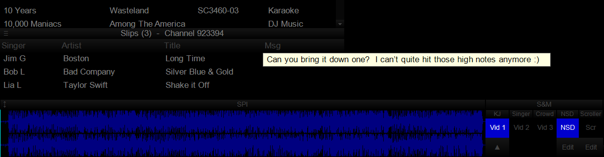 We learned that there is an advantage to hiding the bulk of long messages. Data shows some singers are using the message portion of slips to flirt with the KJ. It's good the KJ can keep them hidden until he/she wants to read them. Especially if the KJ's better half should suddenly walk in