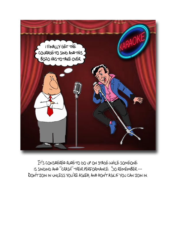 Alan B wrote: Lonman wrote: The other show was a guy, he would just jump up with anyone that would let him - although this is more of a KJ issue not regulating the singing area and getting jumpers off the mic. I have cut off a song dead in it's tracks when that's happened. Got rid of the rude intruder and then started the song again for the singer. It doesn't happen often, but unless you're invited by the singer to join you, I will not let anyone "crash" the singers turn. Jumper-inners are the worst. If the singer is meek, they might be tempted to say it's okay. Stopping the song in its tracks is a great response. I had a cartoon on the front of my book years ago depicting this situation. It showed a creepy-looking guy sidling in on the stage with a mike, and the singer (with a thought balloon) thinking, "I finally got up to sing, and now this loser's barging in." The headline was, "Don't join in unless you're asked, and don't ask if you can join."
