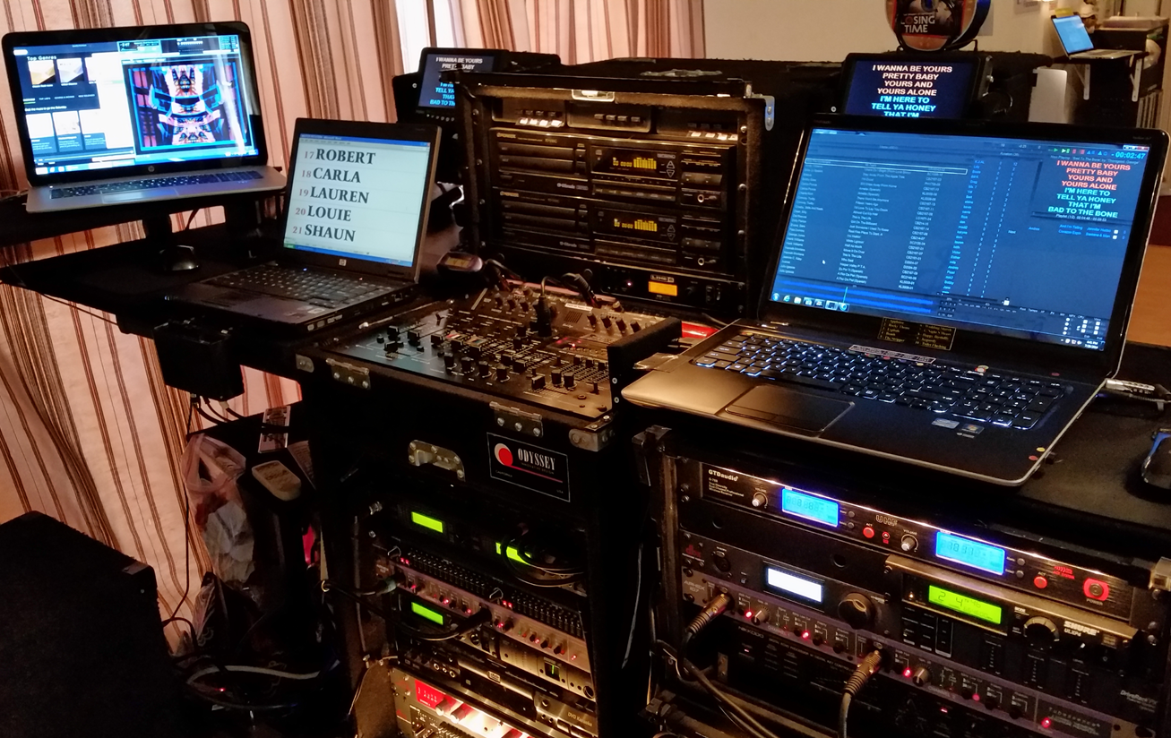 1st laptop: Spotify, split screen with winamp (wamp non-functional; just for 3D visualization effect). This laptop also functions as my download songs for “on the fly” requests; sbi, kv, zoom, thereby leaving the main karaoke laptop to play uninterrupted/worry-free operation while the other is downloading. Drag to flash drive & ready for that singer’s turn.