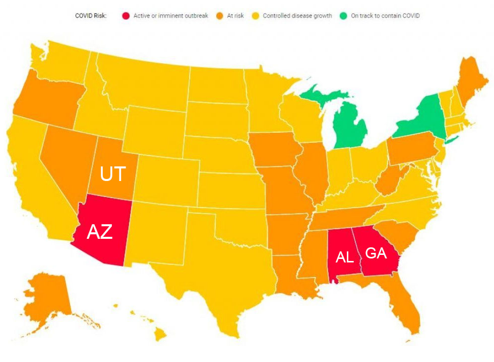 So, since our state is among the safest, I'm ready to go back. Even Utah, is listed as "at risk" on the map (and still climbing, by the way).