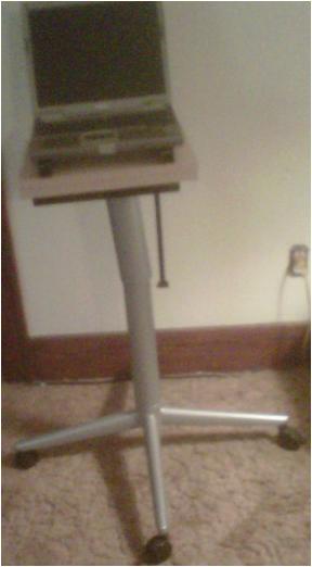I still need to screw the top base cover to the underneath side of the table and not sure if I will leave the handle on or not, I can just unscrew it off if I want. I got this stand for $1. I glued 2 pieces of Oak together after routing out a hole in the bottom one to cover the mechanism that stuck above the surface of the table. 2 1 ft pieces of flex craft (which I already had) are glued to the oak. The top of the flex craft is velcroed to the bottom of the laptop. I made sure I didn't cover the fan. The flex craft allows the laptop to breath. This thing is solid as a rock!