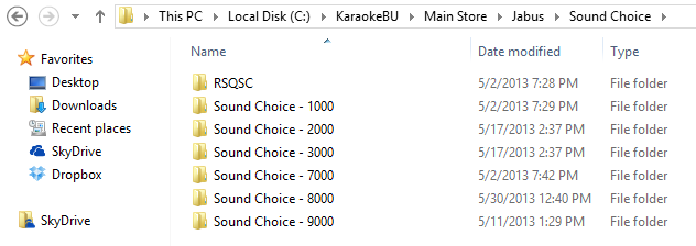 My folder structure is brand -> disk series -> disk -> files. For example: Sound Choice > SC81XX > SC8100, SC8101, SC8102, etc > Files from that disk
