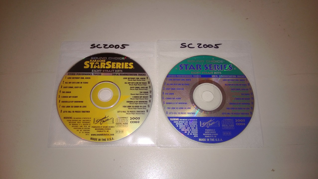 Over the course of doing inventorying my karaoke discs several times, I have run across many discs that have the same content but different print on the disc face. For NuTech, SGB, and other off labels, I understand. But for Sound Choice and Chartbuster, I am just looking for some confirmation that the discs in question are not counterfeit.