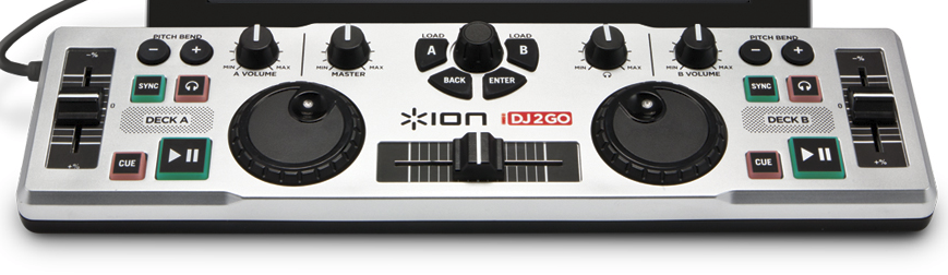 I use a very similar product for my iPod / iPad: ion iDJ2Go for $25 on ebay http://www.ionaudio.com/products/details/idj2goThey have a DJ app for it "iDJ2Go" but I prefer Algoriddim’s djay 2 app.