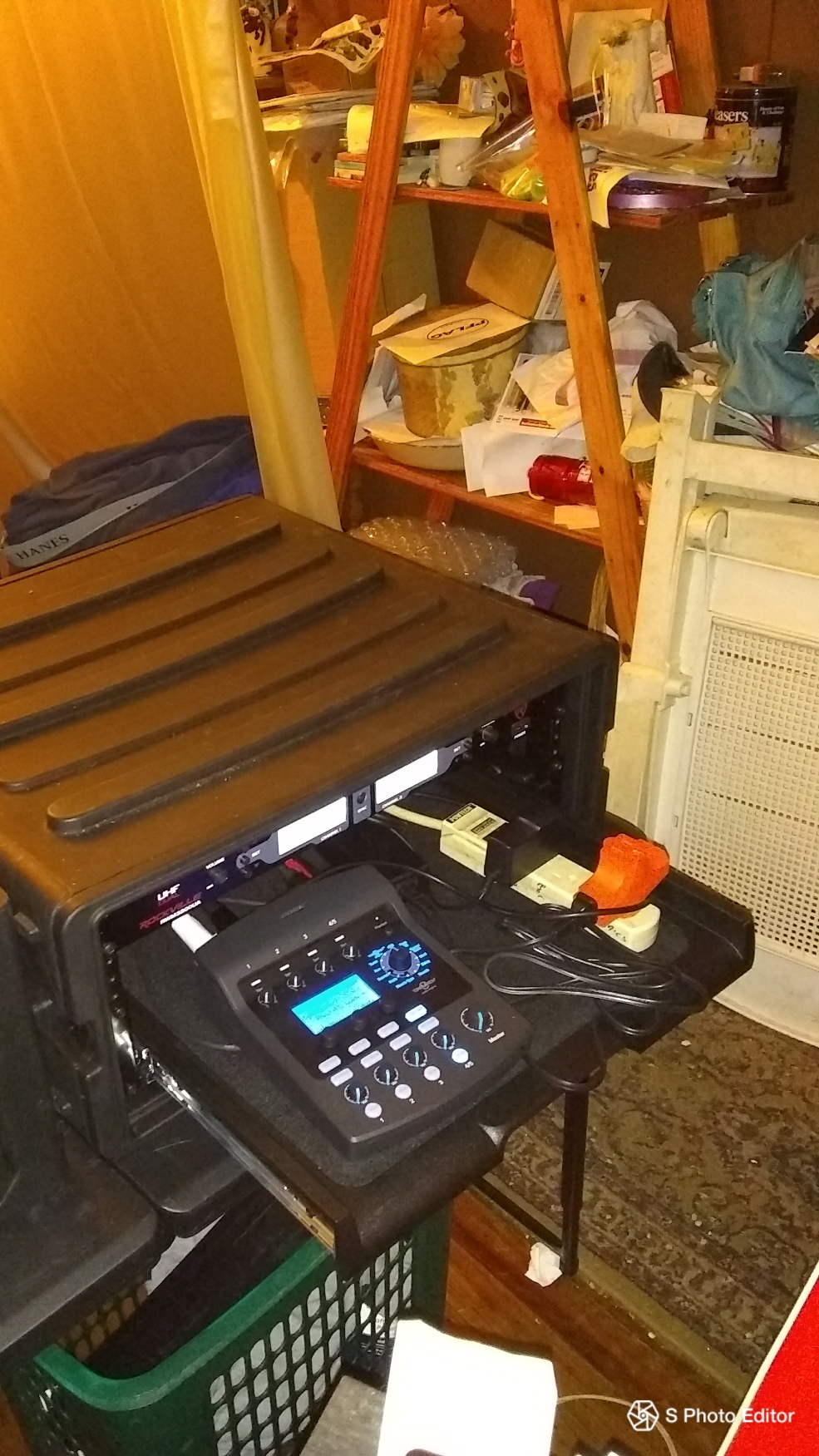 Paradigm Karaoke wrote: mrmarog, are those plastic shelves that you painted black? I purchased them from Home Depot about 8 years ago. They are black plastic. Home Depot shelves are now gray or tan. I also found a folding table and removed the laminate surface from it and attached it to the plastic shelving. The back rest is made from the spare legs with 1 inch pvc inside it for reinforcement. I used a 1 1/8 hole saw and made several holes in the channels of the shelving and routed my wires through the channels. I have been using the same rig for 8 years. It has cracked in a couple of places but nowhere that causes any structural issues. You have to be careful with it, but because it a very small size it is easy to handle carefully. It took quite a while to get it all figured out, but the end result was an extremely friendly and comfortable working layout. Ergonometrically speaking it would be hard to improve on. I have now removed the CDG player, the A/B switch and a few other items.