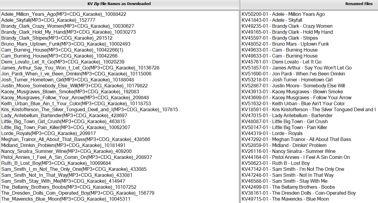 (Click the image above to view a larger version) If you have any of the KV Songs above, I'd appreciate it if you could let me know here if your zip number and your cdg/mp3 numbers match mine or not. Trying to verify whether the zip file number is actually a unique "registration" number for each song purchased and is different for everyone who purchases the same song, and/or if the cdg & mp3 filenames are the same for everyone. I believe the cdg & mp3 file numbers are the actual catalogue numbers and if so, that is the number that everyone should use to make it ubiquitous wherever you go. My renamer beta currently just spits out a side by side list of the zip files and the cdg/mp3 filenames. It does not actually make any changes to the file names. If anyone wants to run it and post some or all of your KV titles let me know and I'll send you a download link and you can run it and share your results here or pm them to me.