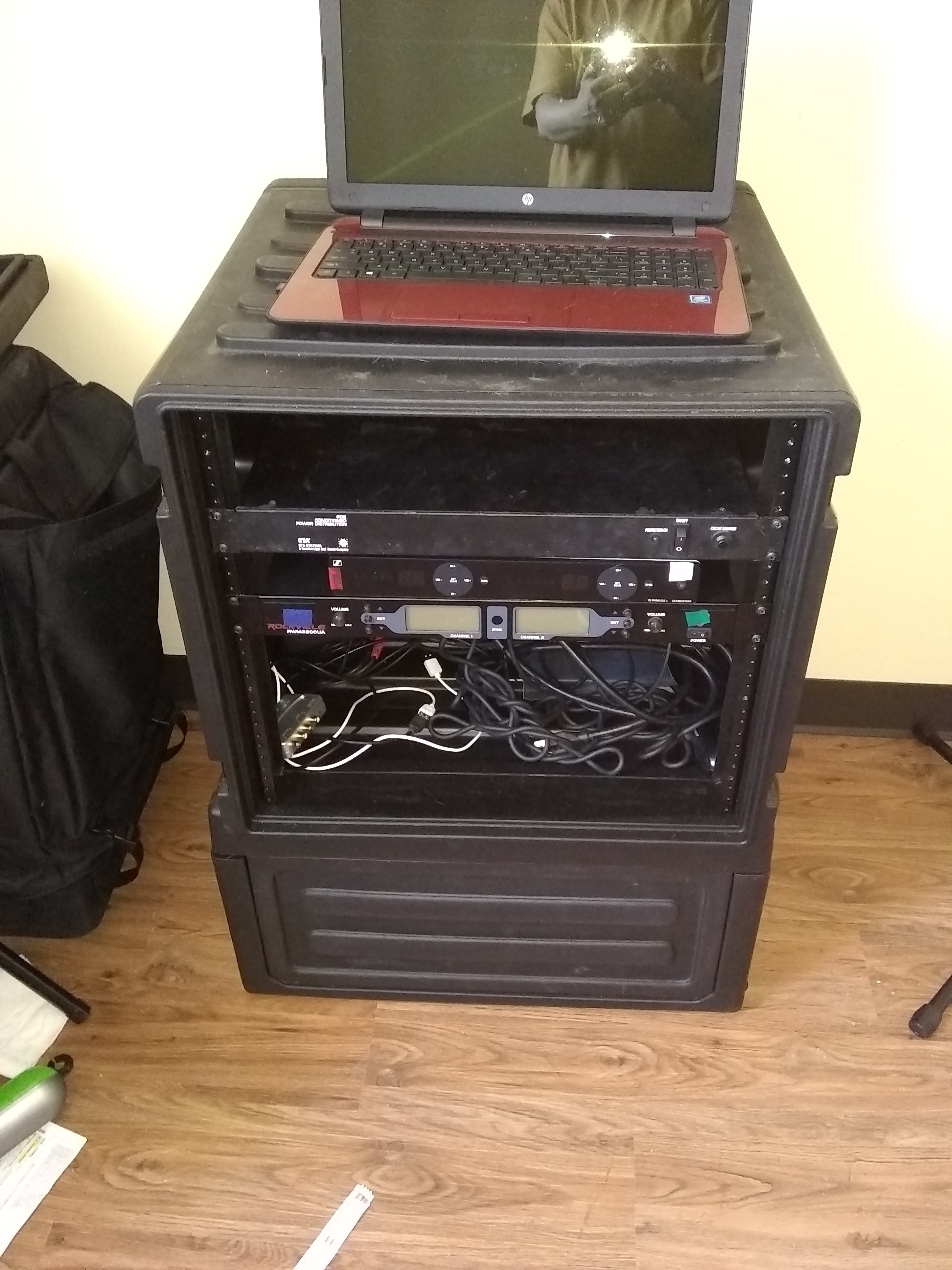 mrmarog wrote: Danny, Is that the best you can do with the wiring?  That's just temporary. All of the wiring actually will be in use out the back and won't be visible during the show. Right now that is where it's being stored for transport and when it's not in use. When I get the new equipment, I won't be storing any of the cables in the rack and the only cables in there will be connected to the mixer and the respective equipment. I plan on tying up the cables in there to keep them from getting tangled up in the sliding shelf.