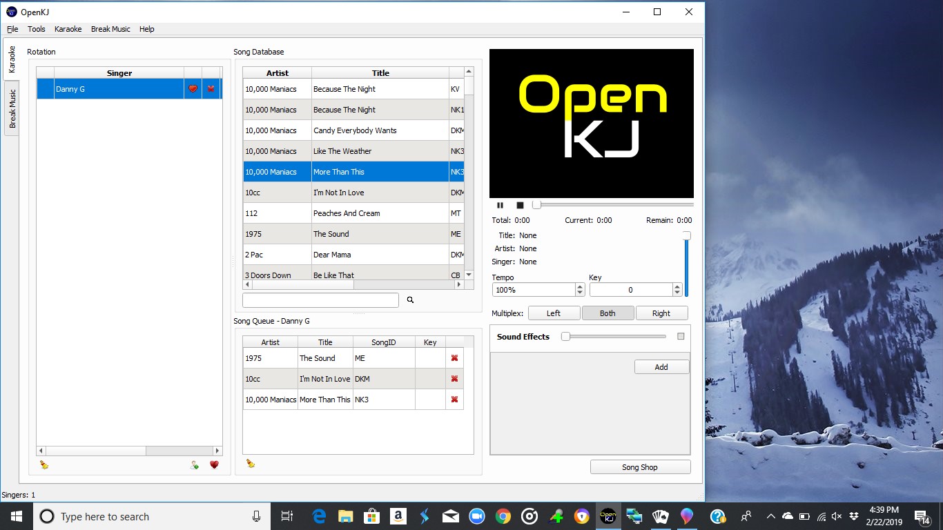 1) Open KJ program 2) Click the heart and add the desired singer to the rotation 3) Notice in the rotation (LEFT SIDE) the displayed track to confirm with singer this is the song he/she will be singing. 4) Song Que (Bottom Center) displays history of previous tracks and can be moved by simply dragging and dropping them to the requested order of the singer. 5) Song database (Top Center) is where you can search or add new songs to the singers list by simply highlighting the singer and double clicking on new songs to add to song que or simply drag and drop from song database to the song que.