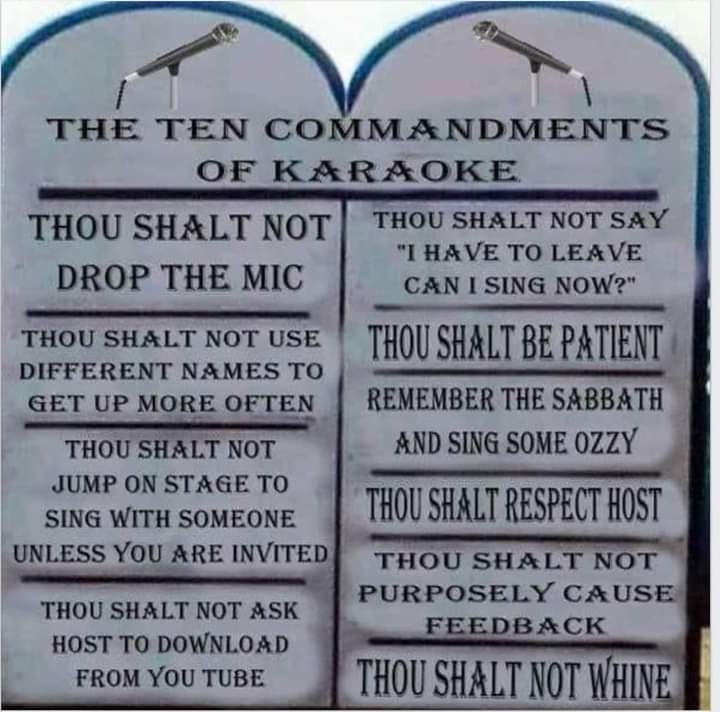 Commandment #12: It's 2022. Don't ever ask any more KJs ever to give you more Reverb. (It's nothing against Reverb. This has everything to do with people who go around everywhere and command reverb before every song that they sing. You just can't keep doing this for the rest of your life and the rest of my life. At some point, you've got to just let it go; let the demands for Reverb go. Because asking for reverb everyday, everywhere you go, every time you get on a mic for karaoke is a Godforsaken, thankless, bottomless, abyss. This person will never be satisfied. If tonight, I have your Reverb perfect, just the way you'll like it, you'll be back the next night or the next time requesting, no actually absolutely demanding that it be perfect again. Like all the perfect Reverbs I've given you before that night, in the past, all never ever happened. Because you want it again. And if it's not perfect again, you will complain. HARD. But what about all the perfect Reverbs I've given you in the past? All forgotten. You won't give me a break. So, no Reverb. Get over it. Karaoke isn't a perfect thing. It's not even your song, you don't own it, you didn't create it and I'm in no obligation to give you Reverb at anytime, anyway.)