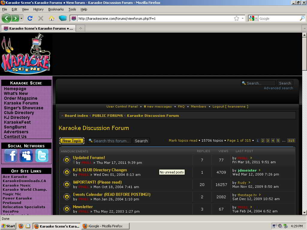 KARAOKE SCENE MAGAZINE ONLINE! - Updated Forums: Too many Announcements... Administrative Comments, Suggestions & Questions Karaoke Scene's Karaoke Forums Home | Contact Us | Site Map