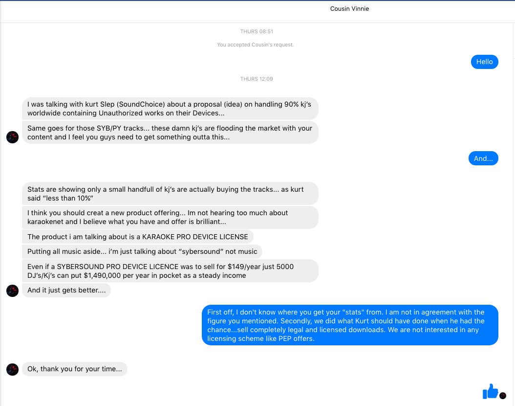 Sound Choice being #1 or coarse. We do. All that is required is to create an account and then buy whatever you want for 1.99 per song. Old songs, new songs and even requested songs!  Just like I told you when you messaged me. I don't think that's what he meant. I believe he's referring to the offer he made you (at 50 cents a track for everything) that you turned down. Actually of you look at the screen shot I attached, he made some statistical quotes I disagree with as well as proposing a "Pro License". But honestly, I find it hard to follow many things posted by Cousin Vinnie...so who knows?