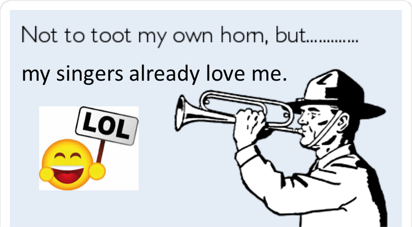 Brian A wrote: Alan B wrote: It sounds like what you're really saying is "I just want my singers to love me".  . I like to interact with my singers as well. Posted in jest. (just kidding) Attachment: toot.png It's OK, Brian. Someone's got to "toot" it for you, even if you have to do it yourself.