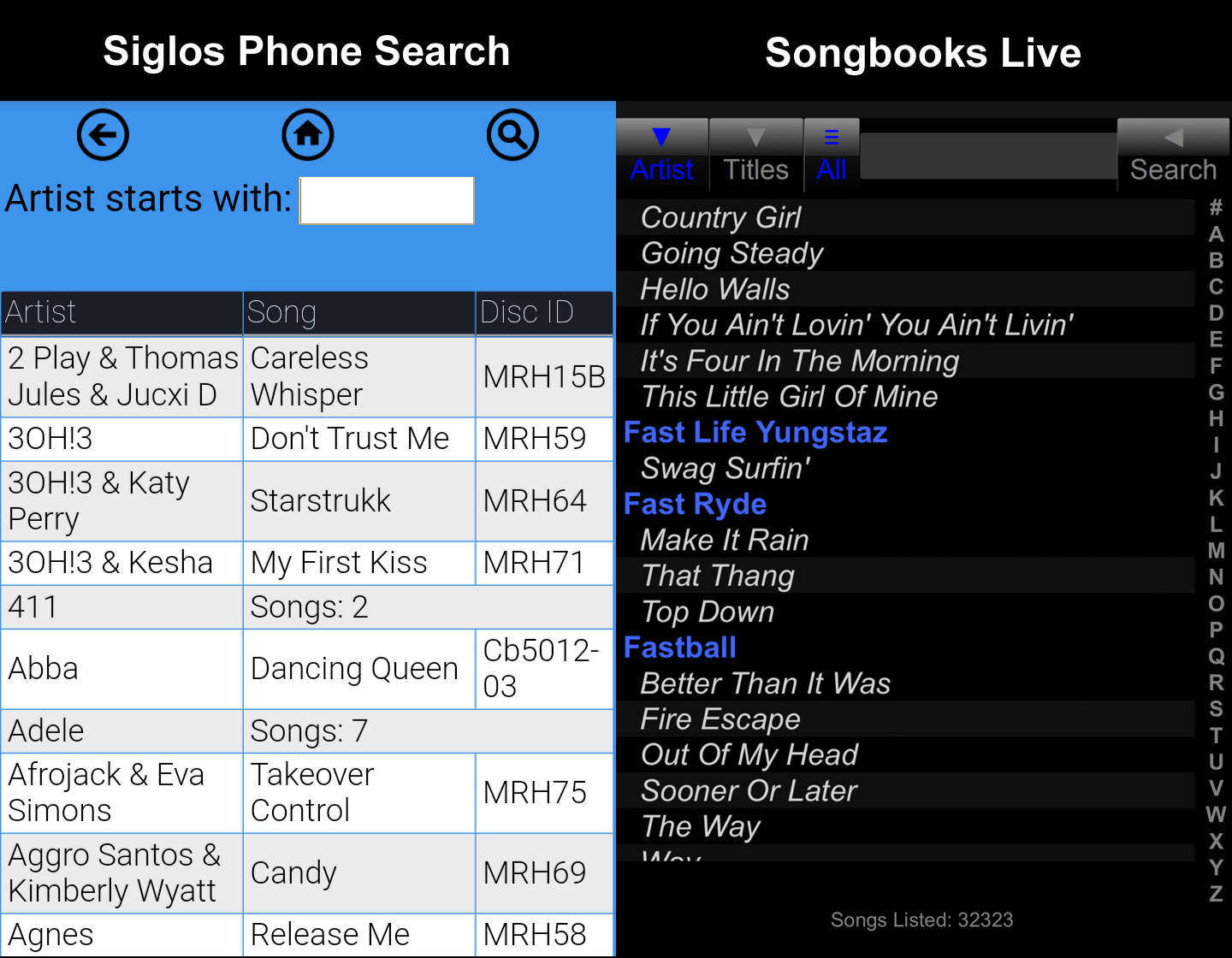 I like the one on the left. Aside from looking a little nicer to me (the font and styling of the Songbooks Live app looks very dated to my eye) I really want to know what versions of a song a KJ has. For me, that is a must-have if a KJ puts their catalog online. Most people won't care, but some karaoke regulars do. No comment on the other aspects of them (price, number of apps, etc.)
